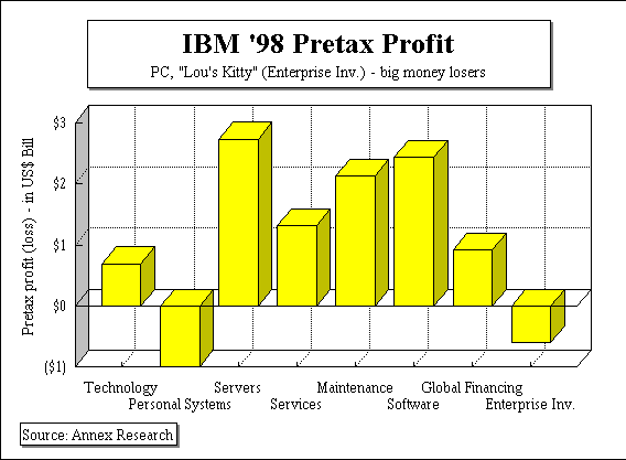 The "new news" about IBM's PC business is that even after all the Armonk fudge is applied to it, this second largest part of Gerstner's "business portfolio" lost about $1 billion in 1998 (as we said it had lost in 1992 - see Annex Bulletin 93-26, May 1, 1993). And have been losing money on its PCs every year since... Including in the last two years (1996-1997) which had been hailed by Armonk's "pontificators" as a "PC recovery" period. And it was. In an weird way. IBM went from losing billions of dollars on PCs, to "only" a few hundred million. Like the person who keeps hitting his head against the wall only a couple of hours a day, instead of 10, Armonk's relief must have been immense. Which perhaps explains its overly exuberant characterization of its PC "recovery." "Lou's Kitty." And then there's "Lou's Kitty," possibly the most egregious example of gerrymandering and misleading the investing public. Of course, you won't find any such terms in the IBM 1998 Annual Report. Instead, you will see a new business segment called "Enterprise Investments" (already mentioned earlier in this report).What is this new business? EI "provides a spectrum of initiatives in IT solutions, supporting the hardware, software and services segments of the company," reads the vague explanation in the 1998 Report.