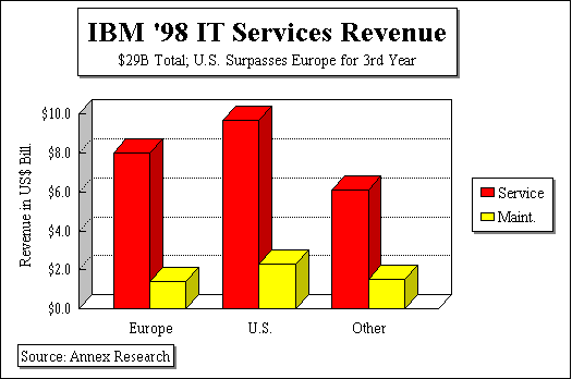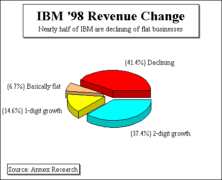 IBM's IT services is a booming $24 billion operation with a pretax margin of a mere 5.5% (and even that is a HUGE increase from the 2.2% equivalent margin in 1997). The maintenance, on the other hand, is a mere $5.2 billion-business segment, but with a pretax margin of 41%. As a result, maintenance accounts for 62% of the IBM GS hybrid's published 1998 pretax profit - $3.8 billion (including Armonk's fudge; or $3.4 billion with the fudge scraped off by Annex). Without the maintenance, the IT services' $1.3 billion pretax profit makes it only a distant No. 4 within IBM's " business portfolio," behind servers, software and maintenance. But the IBM GS hybrid gets 100% of the credit and looks like No. 1 in the eyes of the uninitiated, since the 62%-38% maintenance/IT services breakdown is never shown anywhere in the IBM 1998 Annual Report. And that's not misleading the "Ma & Pa" investors? Illusion of Growth. Furthermore, of the 14 business segments grouped in seven gerrymandered IBM lines of business, nine are declining businesses, and two are basically flat. Together, these less than exciting businesses account for nearly half of IBM's revenue (48%). That's another FACT which you will not find in the IBM 1998 Annual Report.What you will see is a lot of boasting about IBM's growth businesses - the IT services and OEM hardware. What you won't see is IBM disclosing that its OEM hardware pretax profits have plummeted by an estimated 65%, even as its revenue surged by 22%. And that its "Technology" segment, one of the 1998 gerrymandered groups, experienced a 41% drop in pretax profits. And one reason you won't see it is because IBM slapped on $4.6 billion of internal revenue fudge to this group's revenues, obfuscating the real world issues. Server Troubles? " Everybody" knows by now that IBM's server businesses are in trouble, right? Wrong.Battered and forlorn; shrinking and scorned, the IBM servers still contribute more than double the amount of money to the company's pretax profit than the suddenly "cool" businesses, like the IT services ($2.7 billion vs. $1.3 billion). In fact, the S/390 alone, despite its declining $5.5 billion revenues, is still more profitable than IT services $24 billion business ($1.4 billion vs. $1.3 billion in pretax profits).