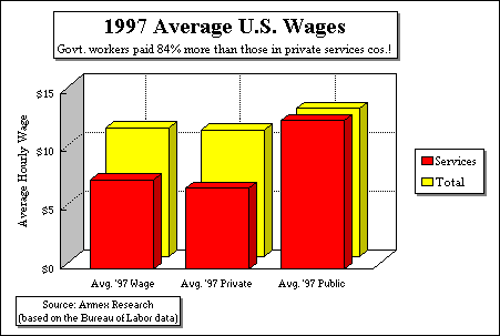 The average 1997 wage in the latter job market segment was $6.87 per hour. This means that government workers, who made and average of $12.63 per hour, were paid 84% MORE that those in private services enterprises! So while the government sector has made some headway in its own downsizing, there is still a wide discrepancy between the civil servants' wages, and those in private businesses. What the government needs to do is pretty self-evident. Implement immediately DEEP salary cuts at all wage levels except for those earning $5 per hour or less. Invest in productivity-boosting tools, such as Information Technology (IT) equipment and services. After all, it is precisely because the IT technology helped increase the productivity of American businesses, that the U.S. worker was able to have a 4.2% wage increase in 1997 without a corresponding inflation. The American worker got paid more in 1997 for producing more. Services Jobs' Growth Slows The wage issues apart, there has been a discernible slowdown in the growth rate of the U.S. services jobs (up 2.5% in 1997). This segment of the economy added about 900,000 new jobs in each of the last two years. That's not bad. But it's not as good as in 1995, when this sector generated 1.1 million new jobs, or in 1994, when it created 2.4 new employment opportunities.