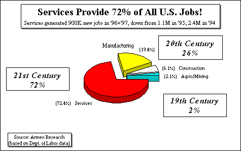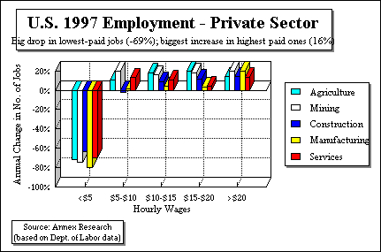 The copyright-protected information contained in the ANNEX BULLETINS is a component of the Comprehensive Market Service (CMS). It is intended for the exclusive use by those who have contracted for the entire CMS service. GLOBAL TRENDS Analysis of the 1997 U.S Employment Statistics The Upsizing of America But Services Growth Slows; Its Wages Are Well Below Rest of Economy PHOENIX - There are more, higher-paid jobs everywhere in America. The latest U.S. Bureau of Labor statistics show increases in 1997 in ALL industries - from agriculture, to mining, to construction, to manufacturing to services.Overall, the U.S. employment was up 2.1%. The private sector jobs surged by 2.7%, while the three tiers of government downsized by 1.8%. Of particular note is the resurgence in, what we called the "19th century jobs," those in agriculture and mining. These two sectors posted 3.3% and 18.4% gains respectively. Construction also had a strong showing in 1997 with a 5.0% increase total jobs, while services and manufacturing rose by 2.5% and 2.0% respectively. Where is the growth coming from? From the White House, if you listen to the Clinton administration's self-congratulatory comments. From Wall Street and the Fortune/Forbes 500 boardrooms, if you pay attention to the establishment media. The truth is - none of the above. It's coming from Main Street, the small and medium size American companies. The Bureau of Labor doesn't not keep employment statistics by types of enterprises (wonder why not?). But a September 1996 Wall Street Journal Oped, written by Fidelity Management's vice chairman, Peter Lynch, showed that in the 1980s, for example, the Fortune/Forbes 500-type companies dumped some 3 million American jobs like excess baggage, and are in the process of doing an encore in the 1990s. Yet the U.S. economy recorded a net INCREASE of 18 million jobs during the same decade! In other words, American entrepreneurs generated 21 million new jobs in the