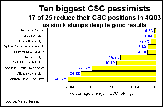 Whatever their motivation, 17 of the Top 25 CSC holders sold off their holdings in the last three months of 2003, some quite aggressively. So as you can see, the fourth quarter actions of the HP versus CSC institutional shareholders is a study in contrasts. HP's were keeping the faith, while CSC's were losing it. At least, that's the story the numbers tell.