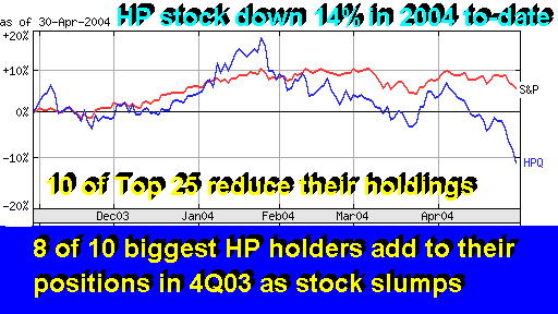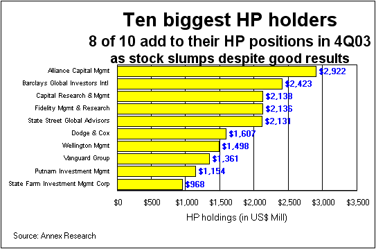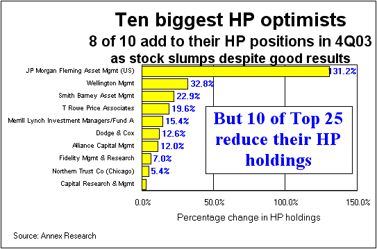 JP Morgan Fleming, for example, wasn't even on the Top 25 HP list the last time we checked (as of Sep 30, 2003). Yet after buying 16.5 million shares in the fourth quarter, a 131% increase in its HP positions, this Wall Street is now the 14th largest HP shareholder. And JP Morgan Fleming is certainly HP's biggest cheerleader when it comes to putting one's money where one's mouth is.