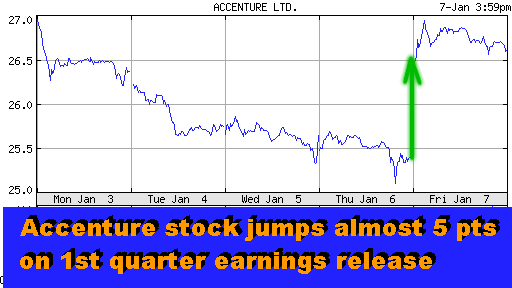 in the marketplace." Gross margins, or gross profit as a percentage of net revenue, fell to 33% percent from 34% percent last year, due to higher compensation and short-term labor shortage. But the company said it did not expect the trend to continue. Business Outlook The recent wave of software mergers is expected to bring new business, the Accenture CEO suggested in a teleconference that followed the earnings release. "Any time you have change, that creates an opportunity for someone to help you," said Green. Accenture said it plans to add 15% to 20% more people this fiscal year to its 103,000 existing payroll. The company has also revised upward its outlook for the full fiscal year 2005. Accenture now expects net revenue growth in the range of 13% to 16% in U.S. dollars, and earnings per share between $1.41 to $1.46. All this adds up to the most bullish outlook we have heard from Accenture executives ever since the company went public in 2001. And Wall Street evidently got the hint. Finally. Happy bargain hunting! Bob Djurdjevic