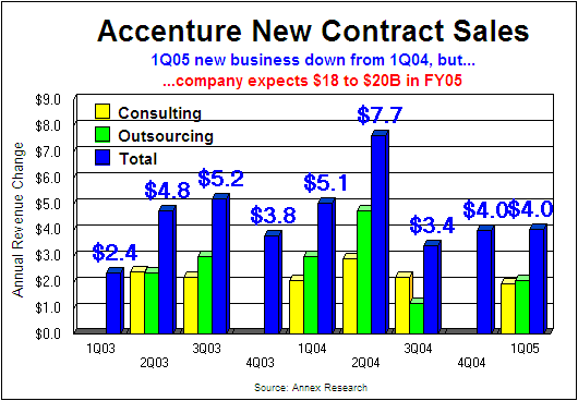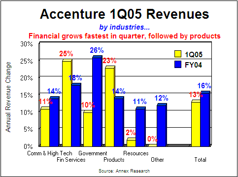 A SPECIAL ANNEX NEWSFLASH Analysis of Accenture's First Quarter Fiscal 2005 Business Results Strong Finish, Better Start Business Performance, Stock Market Finally in Synch WESTERN AUSTRALIA, Jan 7 - Accenture finished the calendar 2004, or started its fiscal 2005, if you prefer, with its strongest quarter on record. Revenues for the quarter ended November 30 were $3.73 billion, compared with $3.26 billion, up 14% in U.S. dollars year-over-year, or up 9% in local currency. Both outsourcing and consulting revenues jumped in double digits (by 15% and 14% respectively). “Our net revenues were the highest of any quarter in Accenture’s history, with growth in all three geographic regions, and U.S. dollar growth in all five operating groups," said Bill Green, Accenture's CEO in a statement. “We are particularly pleased with the growth in our consulting revenues, the strongest we’ve seen since we became a public company.” Consulting revenues were $2.4 billion, or 64% of total, while the outsourcing business accounted for $1.3 billion, or 36% total. So the Accenture shares surged nearly five points on a down day for the market as a whole, finally bringing the company's strong business performance in line with the stock market reaction (see Revenues, Profits Up, Stock Down, Oct 2004, for a contrasting example). Business Segment Analysis Accenture's fastest dollar growth came in its biggest geographic region. Europe's revenues surged by 24% (up 12% in constant currency), while the Asia/Pacific business jumped by 23% (up 19% in local currency).