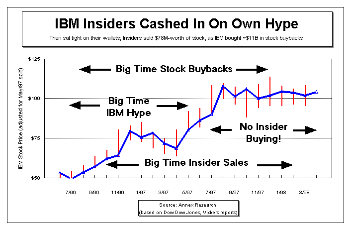 Insiders Sell As Company Buys It didn't take long for the once pristine Big Blue insiders to take a clue from their chairman's behavior that the time of Greed has arrived at Armonk, as elsewhere in Corporate America. In the last 18 months, the period of unprecedented IBM hype and backed up by nearly $11 billion in stock buybacks, the insiders sold some $78 million-worth of the Big Blue stock, mostly by exercising their stock options, for a $34 million-gain. So as IBM was buying big time, insiders were selling big time. Incest? Maybe on America's Main Street. But not on Wall Street. Or at "the new ibm" Armonk. Wall Street is well past incest, and into cloning of the next generation of moral degenerates. Guess there is no such thing as a conflict of interest in a world ruled by Greed? Why Is Nobody Buying? Even more telling of the El Grande Con job which Gerstner, the IBM Board and the Big Blue's executive team have done on the investing public in the last 18 months or so, comes from the latest Vickers Insider Trading report about IBM, which we have just finished analyzing. Remember the old adage - "putting your money where your mouth is?" Well, no one is doing it at Armonk. There has not been a single IBM executive who has BOUGHT shares of the company which pays his/her salary in the last three quarters, according to Vickers. That's some vote of confidence for Gerstner's IBM by his lieutenants! The only exceptions are the newly appointed Board member, Minoru Makihara, president of Mitsubishi Corp., who bought a token 500 shares so he could serve on the Board as a shareholder; and Dave Thomas, and IBM executive, who acquired an even smaller token of 400 "indirect" shares, meaning they were for a family member or a trust.