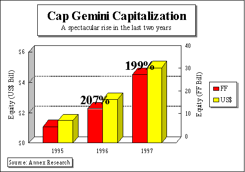 PHOENIX - "Mirror, mirror on the wall, who is the fairest of them all?" demanded to know Snow White's wicked stepmother in an ancient fairy tale. "You are, Your Majesty," the mirror would answer. Until one day, the mirror replied, "Snow White is the fairest in the land," sending the former beauty queen into a rage. Substitute "the most improved" for "the fairest" and the IT industry for Snow White's fairy tale kingdom in the above dialogue, and the Annex Research mirror's answer for 1997 will have to be - Cap Gemini Group (CGG). As reported earlier in the Annex Bulletin 98-15 (4/01/98), this Paris-based IT services firm had a 36% rise in revenue, a 57% increase in operating profits, and a 170% surge in its net profit compared to 1996. Translated into the U.S. dollars, which gained ground against the French Franc in 1997, the CGG growth figures are somewhat lower - 17%, 35% and 132% respectively - but nonetheless still impressive.