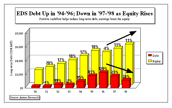 EDS' operating profit was down 12% to $1.1 billion, for a 6.3% operating margin, down from 8% in 1997. In short, EDS' income statement will need a lot of tender loving care and attention by the company's top management. in 1999 and beyond. Balance Sheet. As to EDS' "good news" stories, the company's balance sheet provides several of them.First of all, the equity, the bottom line from the shareholders' standpoint, was up 11% in 1998 to $5.9 billion. Second, long-term debt was down by 34% to $1.2 billion. Third, thanks to the positive cashflow generated by operations, and the fact that EDS' management didn't squander its earnings on stock buybacks as IBM's did, EDS' cash was up by 28% to $1.3 billion. But all of the above, of course, is business substance. At a time when the stockmarket seems to prefer to trade on "fluff," it remains to be seen how much slack investors will cut EDS on account of its "good news" balance sheet stories. Suing a Big Customer When EDS won the Xerox $3.2 billion megadeal in 1994, Xerox CEO, Rick Thoman, a close friend and confidant of IBM chairman Lou Gerstner, was then an IBM executive. Naturally, back then we had no idea that one day, EDS and Xerox would lock horns in a court battle. After all, it's not every day that you see a major company sue one of its biggest customers in a "megadeal" dispute. The last time EDS was forced to do it was in 1992, when it sued the state of Florida. That dispute was eventually settled in 1995 through arbitration. Citing confidentiality clauses in its Xerox agreement, EDS said that it couldn't comment on the latest lawsuit. But even without the benefit of today's hindsight, we warned in 1994 that the Xerox deal could be a Pyrrhic victory for EDS. It may temporarily boost the company's revenue and new contract sales, but it may also hurt its long-term margins. For, the hotly contested "megadeals" are often like the game of chicken: The last bidder to say "no" gets stuck with the deal. Here's an excerpt from the Annex Bulletin 94-46 (10/19/94):