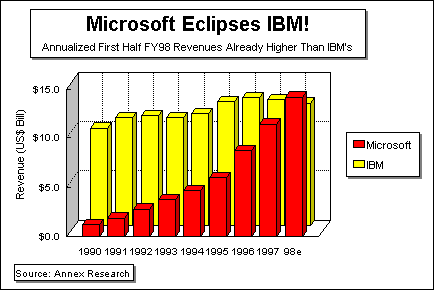 So finally facts have caught up with perceptions. Microsoft is indeed now the world's largest software company! This also fulfills a prediction we made some two years ago when we said that Microsoft will surpass IBM in 1998 (see Annex Bulletin 96-27, 4/24/98). If anything, the Microsoft eclipse has occurred a little sooner than we had thought, thanks to IBM's slump last year, when its software revenue decline 2% (see Annex Bulletin 98-02, 1/20/98). Nor is the outlook much better for this year, as the Big Blue continues to face the erosion of its mainframe software base, which still accounts for a giant (70%+) share of its total revenue. Another Eclipse: Strong Platforms' Growth The shipments of the Windows 95 and Windows NT operating systems, the main components of what the company calls its Platforms Products Group, have been soaring in the two-and-a-half years since the Windows 95 announcement. During the FY97, the Platforms' revenue was up 45% as compared to "only" an 18% rise in Applications and Content revenues. This has led to another eclipse. For the first time ever, the Platforms' revenue has exceeded that of Applications'. In the FY97, the former accounted for $6 billion, or 53% share of the company's' revenues. Microsoft's "OEM revenues" (the license fees paid by the PC manufacturers which ship their systems with pre-installed Microsoft software) have more than doubled in the two years since the Windows 95 announcement. During the FY97, they increased by 39% to $3.5 billion, or almost one-third of all Microsoft revenues. And the momentum has carried on into the FY98. During the last quarter, the "OEM revenues expanded (by) 40%," according to Greg Maffei, Microsoft's CFO. No Respect Yet, despite such tremendous business results; despite becoming America's richest man; despite becoming a household word; Bill Gates may go down in history as "the computer industry's Rodney Dangerfield." Not only has he become the butt of more jokes than most celebrities, with a possible exception of Bill and Hillary Clinton, but this Microsoft "pied piper" has now been also ignominiously pied smack in the "capital of Europe" - the seat of the European Union. What an indignity! Which goes to show us that you can't buy respect. To his credit, the Microsoft chairman seems to understand that. Responding to a question after his recent talk at Stanford University, Gates, whose personal fortune is estimated at over $30 billion, made a comment which is bound to startle many, especially his critics. Gates said he did not intend to pass his fortune on, and that at a later period in his career he plans on giving away most of his wealth. "I am just a steward of this wealth, and some day I will return it to society," he said according to a Jan. 28 New York Times report. Such an act of philanthropy may eventually earn Gates the respect he is now lacking. Unless, of course, he does a Ted Turner, and turns his money over to the United Nations bureaucrats. In which case a lack of respect may quickly turn to scorn. Let's hope that Gates will have more sense and indeed give it back to society at large. Happy bargain hunting! Bob Djurdjevic Additional Charts
