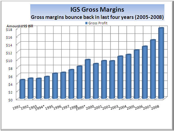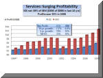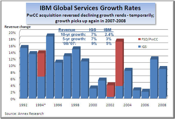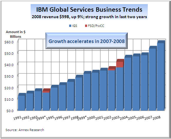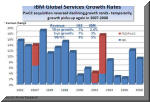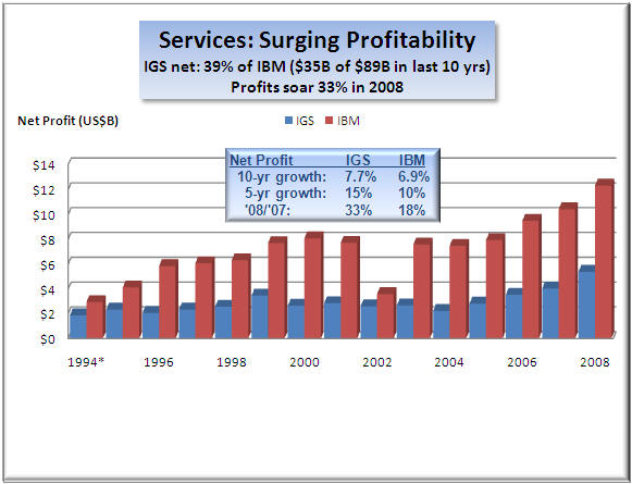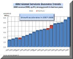 Updated 5/03/09, 11:30PM PDTAnalysis of IBM Global Services' 2008 Business ResultsBack on Growth TrackServices Now Again Boost IBM's Revenue and Profit Growth Rates; But First Quarter Shows Some Clouds on HorizonHAIKU, Maui, May 1 – One rarely sees in business or in life that the biggest entity is also the fastest growing. IBM Global Services is evidently an exception to this general rule of thumb. At $59 billion in annual revenue, Big Blue's services arm is several times larger than most of its top competitors. In 2008, it has also grown faster than most, and more rapidly than IBM as a whole. Our analysis of IGS's 2008 business results shows an operation whose steady growth (left chart) has accelerated in the last two years, as several of its major competitors began to sputter, after slowing down in 2005-2006 and 2000-2002 periods. As a result, IBM's two services units - Global Technology Services (GTS) and Global Business Services (GBS) have resumed their leadership position within Big Blue's lines of business. In 2008, they have outpaced IBM's corporate revenue grown 9% to 5%. For the last five years, they have grown at 7% versus IBM's 3% overall compound annual growth. And in the last decade, they have outpaced the corporation 7% to 2.4% (middle chart). More importantly for IBM shareholders, IGS has outpaced Armonk's corporate profitability growth by an even greater margin during the same periods. Last year, IGS' estimated net earnings grew by 33% over the year before, versus IBM's (impressive) 18% overall surge, despite a global economic slowdown. During the last five years, IGS led by 15% versus 10%. And in the last decade, IGS's profits outpaced IBM's 7.7% to 6.9% compounded annually, despite some hard times in the 2001-2004 time frame (right chart). What Changed? So long gone are the times from the mid- to late 1990s when services boosted IBM's revenues while being a drag on Big Blue's earnings. What has changed since then? Well, the biggest change was that today IBM has a leader whose focus is on improving the quality of his operations rather than quantity. In the services business, that translated into doing things more efficiently and at lower cost while keeping an eye on the top line, too. IGS certainly cannot claim