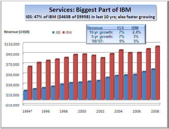 Services in a Box , Sep IBM also has a unique advantage over its other major global services competitors. It can and does use its software and hardware divisions' products as a unique way of packaging its integrated solutions, especially for large enterprise customers. In the case of GTS, for example, IBM hardware and software accounted for about $2 billion as compared to $30 billion of the "pure" services revenue in 2008. More importantly, some of these services deals might not have happened without the advantages that IBM's software and hardware solutions provided. As a result, new business signings, for example, were very strong in the fourth quarter of last year. In the midst of the deepest recession the world has seen since the Great Depression they were up 20%. GBS (consulting) sales weren't as strong, as long-term engagements contracted 18% for the year. Obviously, customers have been putting more emphasis on execution and immediate savings than on long-term planning and strategic transformations. Finally, IBM's holistic approach on treating businesses as living organisms rather than a conglomeration of individual parts has been reflected in its global services strategy (see IBM's Holistic Approach - secret of success, Feb 2009). Summary & Outlook During the last 10 years, IGS