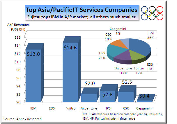Elsewhere around the world, the gap between IBM and HP is smaller, such as in Europe, for example (middle right chart).  And in some market, such as in Asia/Pacific, IBM is not even the biggest competitor (right).  That's where Fujitsu holds the pole position.  But there is no question that overall, IBM was and still is by far the largest competitor in the global IT services arena.