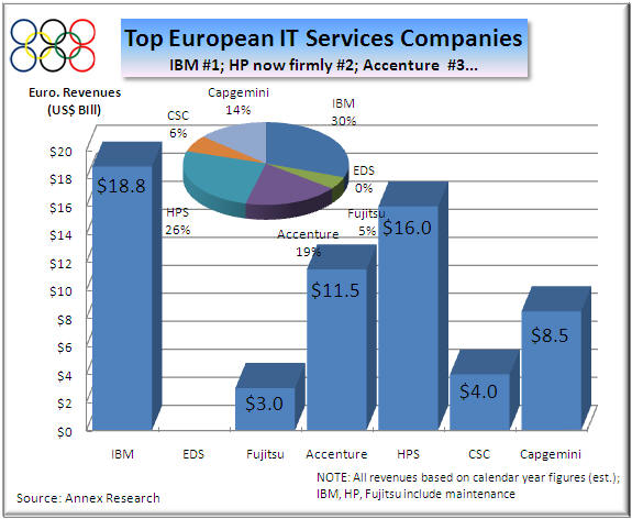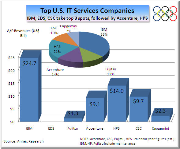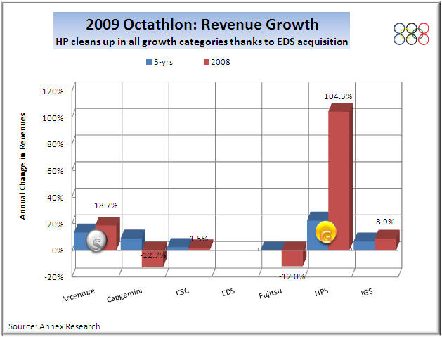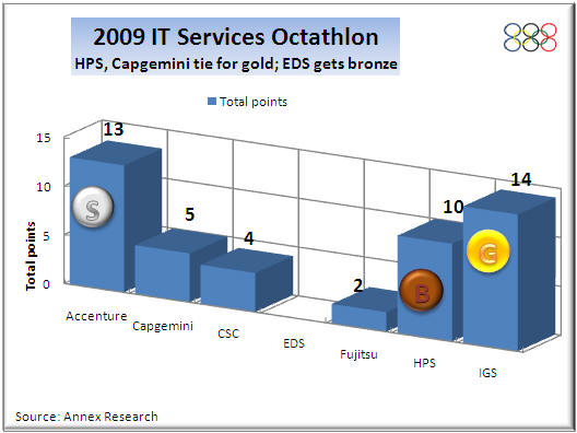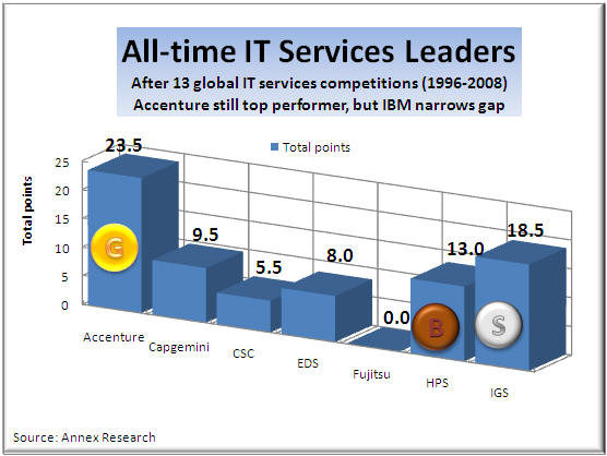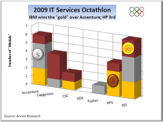 No matter.  It was an exciting finish nonetheless.  In the end, IBM Global Services (IGS) nosed out Accenture for the "gold."  HP, the new behemoth of the IT services industry, finished third despite winning all of the revenue growth medals (thanks to that EDS megadeal, of course).