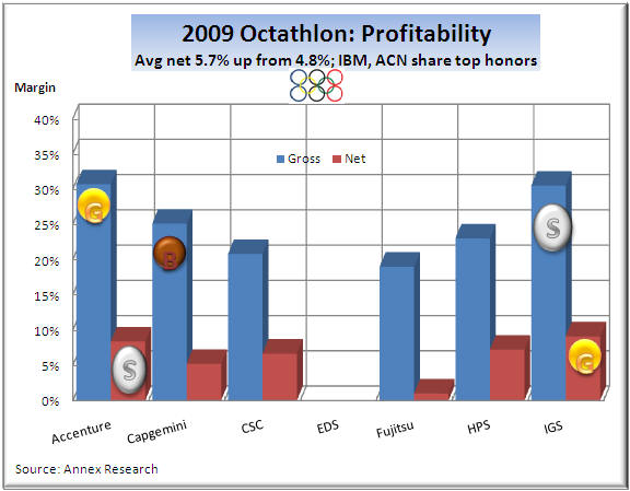 The average net margin of the top six competitors surged from 4.8% two years ago, to 5.7% in the latest Octathlon.  And that's in the middle of the world's worst recession since the Great Depression!  That's in part due to an increased footprint that all top global IT services "Indians" have in the (cheaper) Indian labor market.  The outsourcers and outsourcing so as to lower costs and improve margins.