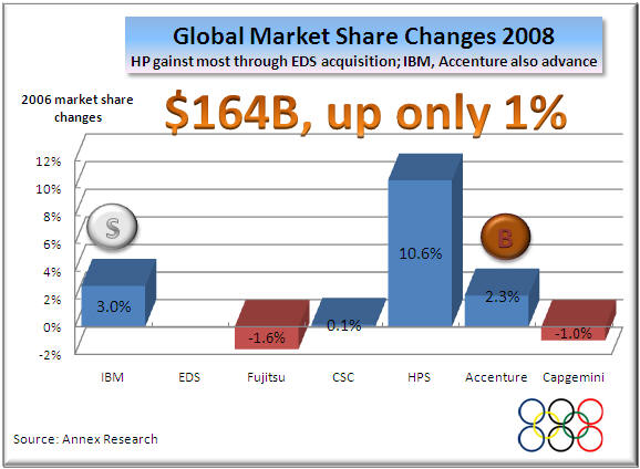 Meanwhile, the aggregate annual revenue growth of the top six was only 1% despite the HP spike caused by the EDS acquisition.  So by the time curtain dropped on 2008, HP, IBM and Accenture gained market share, while others lost.