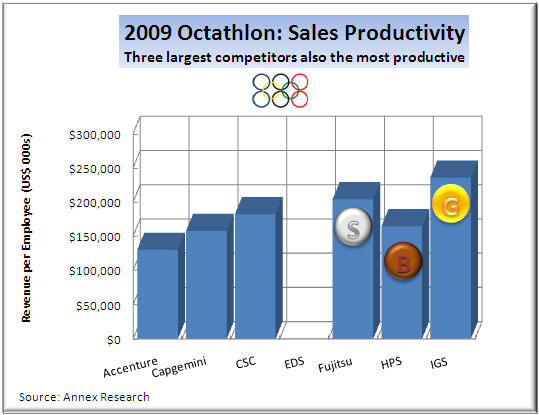 Another interesting phenomenon in the IT services competition is that the companies who create their own technologies also seem to be more productive in terms of revenue per capita.  So year after year, IBM, HP and Fujitsu keep winning the top honors in our Octathlons in the Sales Productivity category (left chart).