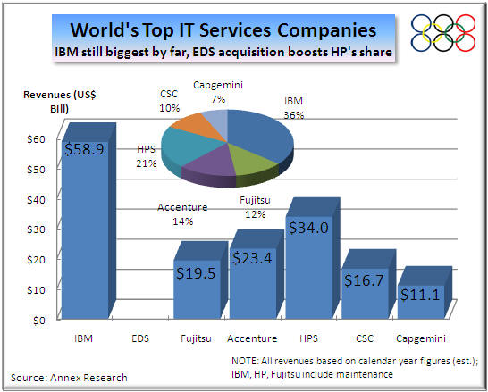 HP's acquisition of EDS has changed the landscape of the global IT services competition, although not as dramatically as one might have intuitively suspected when #6 competitor swallows up the #2.  That's because IBM, with services revenues expected to surpass $70 billion this year, is still roughly double the size of the new #2, especially considering the latter company's disappointing second quarter results (see "Suddenly, All Lines Point South," May 2009).