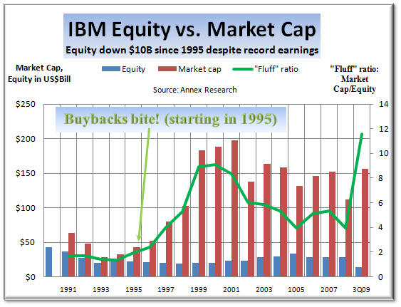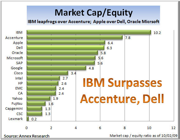 That is how Big Blue became the new "King of Fluff" in the last few years (having attained the highest market cap/equity ratio among the IT industry leaders). IBM did it by giving back its equity to the shareholders (mostly Wall Street) through massive share repurchases. Despite record earnings in recent years, IBM equity has shrunk by over $10 billion since Big Blue started its massive stock buyback program in 1995 (of well over $100 billion). The company did it ostensibly in the hope of boosting its share prices. And you saw what happened. Wall Street took the money and shrugged. And then put it into the shares of Apple, Google, EMC, HP... or wherever else's pockets around the world. "Smart" move, IBM! BUSINESS Rankings of Annex Top IT CompaniesAs for the Top 18 business