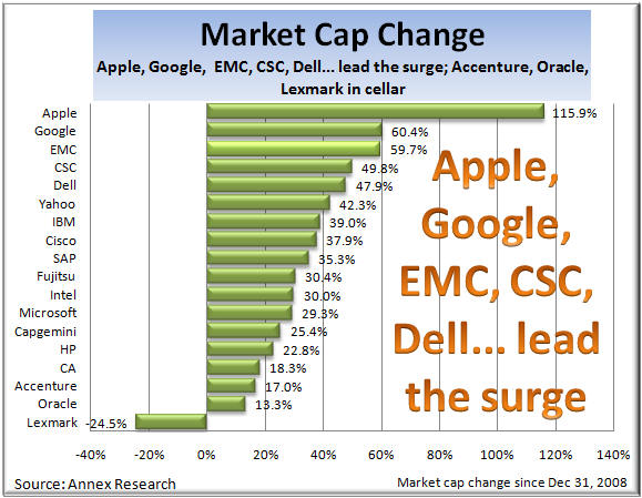 the start of the year. Apple led all leadin At the other end of the spectrum, Lexmark was in the cellar, with Oracle, Accenture and CA above it. Their market cap gains were in the teens (right chart).