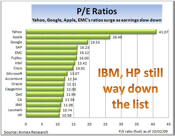 market cap increas See what we meant about Wall Street "feeling" its way through clients' money? While shareholders of these declining companies may have reasons to feel good right now, on the opposite end of the spectrum we have holders of stock in solid companies that have performed well on Main Street, and are not getting commensurate credit on Wall Street. The foremost among them is Big Blue whose stock is again undervalued relative to its peers. IBM at $137? Why Not, If Apple Is at $186; Google at $490; EMC at $17? Oh sure, IBM's market cap also increased by 39% since the start of the year. But that's pittance compared to surges of other IT companies' shares whose profits have declined. If IBM Investor Relations people had done a comparable job to that of Apple's, Google's, or EMC's, the Big Blue stock should have risen at least 50% to 60%. That would put them at about $137, which is the all-time high the IBM shares reached in July 1999. After all, Apple, Google, EMC are still off of their multi-year highs event though their market cap has surged between 50% and 116%, as you saw from the preceding charts. Or take a look at HP, for