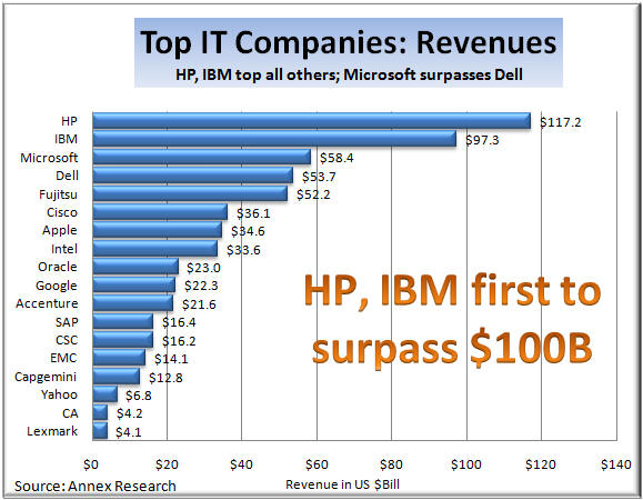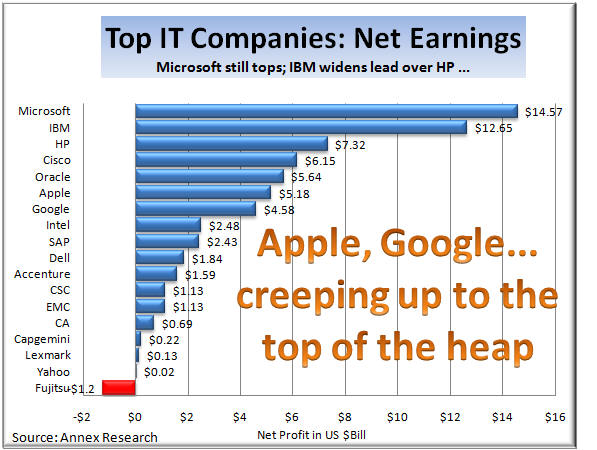 in the last 12 months, only one of the top 18 IT comp At the other end of the rankings, Microsoft is still king when it comes to IT industry profits ($14.6 billion). It is followed by IBM ($12.7 billion), which has widened the gap between itself and HP, in third place ($7.3 billion). Cisco, Oracle, Apple and Google follow in that order, whose net earnings range from $4.6 billion to $6.2 billion. (All these figures are our estimates based on latest annualized results).