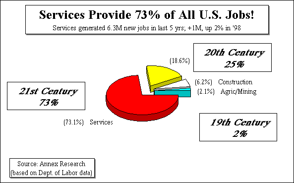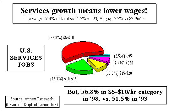 The copyright-protected information contained in the ANNEX BULLETINS is a component of the Comprehensive Market Service (CMS). It is intended for the exclusive use by those who have contracted for the entire CMS service. GLOBAL TRENDS Analysis of 1998 U.S. Employment Statistics More, Cheaper Service Jobs Growth Slows Across the Board; Drop in Manufacturing, Mining PHOENIX, Mar. 11 - The services sector continue to be the growth engine of the U.S. economy, accounting for 73% of all American jobs in 1998, up from 72% in 1997, according to U.S. Bureau of Labor statistics. Since 1993, services companies have added over 6.3 million jobs to the 71.4 million U.S. work force.Which means that some 43.6 million Americans now work for private services companies, up 2% from 1997. Another 8.6 million serve the taxpayers in the three-tier government jobs, up 1.1% from the year before. At a first glance, therefore, it looks as if everybody is a winner in America's new, services-driven economy. But only at a first glance. For, once you start to peel the onion, you begin to see that Corporate America is the only winner, since more services means more, yet cheaper jobs.