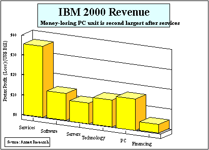 Summary Would breaking up IBM make sense today, we were asked? Yes and no. Yes - if the company is to survive in the long run. No - if the stockmarket valuation is the primary driving force behind it, as it was five years ago. For, after analyzing and comparing the six logical parts into which IBM could be broken up (Services, Software, Servers, Technology, PC and Finance companies) to the peer companies in their respective IT sub-markets, the bottom line is that a vertically integrated IBM is still overvalued today. As you can see from the charts and tables in this Annex Bulletin, we figure that the sum of the parts of a broken up IBM would yield a fair market value of about $150 billion, or $85 per share. That compares to the IBM market cap as of Oct. 31 (i.e., after the Oct. 18 devaluation) of $173 billion or $98.50 per share. Which means that in the current bubble market, even a deflated IBM is still one of the bigger bubbles waiting to be burst at some point in the future. So if the Big Blue were to be broken up now, it would have to be for operational, not financial reasons - survival being one of them, especially for the hardware parts of the Armonk empire. But don’t expect the current IBM management to carry it out. Breaking up was “a dumb idea,” remember? Well, we’ll let the marketplace have the final word on that. For, had IBM split itself up five years ago, and then let its offspring spend $37 billion or more on acquisitions of various dot.coms or other promising future IT leaders, instead of squandering it on Wall Street bribes, Armonk could have been a proud owner today of an AOL, for example. With a Netscape and Time-Warner inside. Or of thousands of future would-be AOLs or Yahoos.