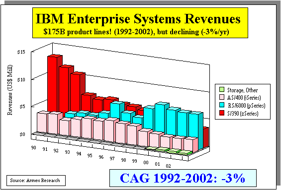 Within that total, the S/390 servers led the decline with an 11% compound annual rate between 1992 and 2002.  Furthermore, the rates of decline for the S/390 line seem to be accelerating.