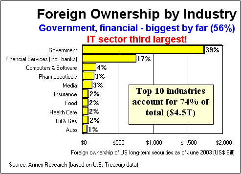 The foreign ownership of U.S. debt and securities is also quite concentrated. Overall, the top 10 industries account for about three-quarters of the $4.5 trillion foreign holdings as of June 2003. How long can this financial hemorrhaging last?