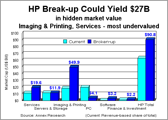 Upside-Down View”, Mar 2005) So how do you go about increasing shareholder value? By forcing Wall Street to value your strengths, and by reducing or eliminating your weaknesses. And how do you do that? By breaking up the company and spinning off various units is one way. If this sounds familiar to our old clients and friends, it ought to be. It is the same recommendation that we made to IBM when its stock was badly undervalued, just as HP’s is today (see "Break Up IBM!", Mar 1996). The main difference is that the break-up scenario in HP’s case in a little less compelling than was IBM’s nine years ago. Back then, we said IBM’s market cap would double (it actually increased more than three-fold in the next three years – thanks to stock buybacks).