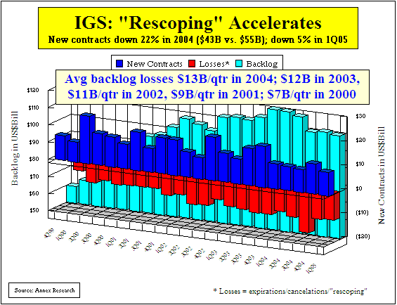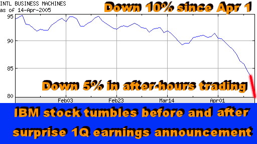 Updated 5/04/05, 2:30 PM PDT (adds "Restructuring") Analysis of IBM's First Quarter 2005 Business Results Slammed and Dunked Stock Drops 5% in After-Hours Trading Even Though Revenues, Profits Rise NEW YORK, Apr 14 – It was supposed to be a slam-dunk quarter. At least that's the way things looked two-thirds of the way through. Instead, it was IBM that got slammed and dunked. By Wall Street - tonight, with more to come tomorrow... Big Blue surprised everyone, including itself it seems, with an early and a disappointing first quarter earnings release after the markets closed today. The announcement came four days early and was six pennies short of the "street consensus" (84 vs. 90 cents per share). Never mind that the first quarter income from continuing operations was $1.41 billion compared with $1.36 billion a year ago, an increase of 3%, and that the revenues were $22.9 billion, also up 3%. One must never confuse facts with perceptions. And perceptions, not facts, rule on Wall Street. As a result, the Big Blue stock dropped five points in after-hours trading this evening, accelerating a steep two-week slide in advance of the announcement that erased about 10% of its market cap (see the chart). And if Accenture's experience last week is any indication, that's only the first strike of a lashing IBM can expect from Wall Street tomorrow and next week. The price decline that left the IBM stock this evening at a 20-month low could not have come at a worse time for the stock market. The Dow Jones Industrials, of which IBM is a part, also set a five-month low today after its second consecutive 100+ point-drop. But the stock market's overall decline has not been nearly as precipitous as IBM's (about 2% vs. about 15% in the last three months). What IBM executives said in a hurriedly-called teleconference that followed the earnings' release, only exacerbated the matter. "This quarter did not play out as we expected," were the first words out of the IBM CFO Mark Loughridge's mouth. "We had a good start to the quarter, consistent with the way we exited 2004. In fact, we had revenue growth of over 6% through the end of February." And then the bottom fell out in March. "Beware the Ides of March," goes an ancient Roman warning. IBM said it had a significant drop-off, primarily in small transactions at the end of the quarter, and March revenue was down. "Given our skew of business within the quarter, the March shortfall significantly impacted the first quarter’s overall growth rate and profitability," Loughridge explained. And boom... the stock started to plummet. The after-hours trading was halted at one stage due to imbalance of orders. Business Segment Analysis IBM Global Services. IBM's biggest unit reported a 6% revenue growth in the first quarter (3% in constant currency). Which was not bad as far as it went. But it was evidently far less than IBM had expected. "We had a disappointing quarter in services," Loughridge did not mince words in expressing his dissatisfaction. "Contributing to the shortfall was a decline in short term signings, that impacted not only the total reported signings, but also our revenue and profit performance."As a result, the IGS pretax profit margin also dropped by 0.8% to 7.6%. But even more disappointing was IGS' continued slump in new sales, coupled with a an on-going "rescoping" problem that is shrinking its backlog. In the first quarter, IGS sold $10 billion of new business but its backlog still declined by a billion to $110 billion at the end of the period. Which suggests that "rescoping" amounted to about $11 billion.