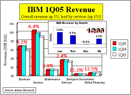 IBM FINANCIAL Editor's Note: This writer was literally in the air, enroute to New York, when IBM made this surprise announcement. So this Annex Newsflash is only our first cut at the news. Stand by for a more in-depth analysis of IBM's first quarter results. Annex clients click here to view our detailed IBM 1Q05 P&L. |
