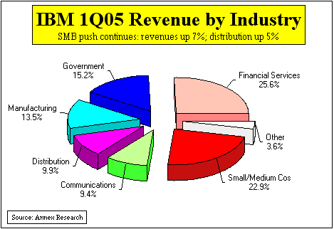 Industries. Some 30 months ago, IBM launched its big push into the small and medium (SMB) business market (see "Finally Heard!", Jan 2003). Big Blue's success in this sector will pretty well make or break its growth strategy, we have been saying for almost nine years now. As of the third quarter of 2004, however, IBM's SMB push seemed to be sputtering (see "Slow Quarter No More," Oct 2004). In the fourth quarter, it merely kept pace with the rest of the business (see "IBM: A Crescendo Finale!", Jan 2005).