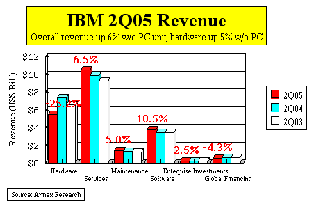 Business Segment Analysis The main reason for the "instant gratification" was that the two "problem children" of the first quarter have both bounced back. IBM Global Services' (IGS) new contract signings surged by 45% to $14.6 billion, while its backlog increased by $3 billion from the first quarter to $113 billion. And the European business has stabilized, with some parts of it (e.g., business consulting services) actually showing robust growth. Hardware. Furthermore, IBM hardware divisions continue to deliver great results. The pSeries, xSeries and iSeries servers, as well as storage, all reported double digit revenue growth. The iSeries' 10% growth was particularly impressive as it represents the first major reversal of its declining trends in 2004 (also see "An iSeries Revival," Mar 2005). The only exception were the zSeries servers (mainframes). They suffered a hiatus in demand as customers awaited next week's new product announcements before resuming their buying spree. And now that IBM is finally rid of its money-losing PC business (see "Lenovo Completes IBM Deal," May 2005, and "IBM 5-yr Forecast: Quality over Quantity," Mar 2005), the hardware profit margins have shot up five points (from 29% to 34%). But a pause in mainframe acquisitions has not slowed the customer demand for its software, or the implementation of new applications using on web-based mainframe tools and capabilities. The double digit growth percentages of all mainframe related software attest to that (since software is an annuity for which customers pay over time, it is not subject as much to the vagaries of product cycle changes as is mainframe hardware). And this bodes well for the mainframe hardware growth in the future. We expect it to resume in the fourth quarter, after the company starts shipping its new systems in September (also see "A zSeries Renaissance: Poughkeepsie Spring," Apr 2005). Software. The key IBM software brands grew by 17% in the quarter, lifting the overall software revenues to a double digit (10%) growth. The gross margin of 86.7% represented a half point improvement over the corresponding period a year ago. Given that IGS absorbed the brunt ($1.2 billion) of the $1.7 billion charge IBM took in the quarter, the biggest IBM unit ended up in the red for the first time in its history. The fact that PC lost money ($149 million) even while singing its Big Blue swan song was par for the course (see "IBM PC: Good Riddance", Dec 2004).
