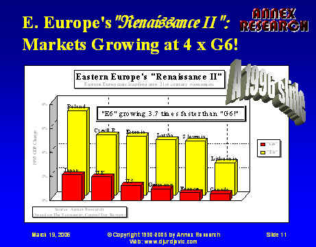 The chart ranks the most attractive countries in the world in terms of the percentage of university educated people relative to the GDP per capita (in other word, the "best bang for the buck" when it comes to high education talent). Six of the top 10 nations, led by Ukraine, Belarus and Russia, are from the CEER region. The "Old Europe" countries - Germany, Norway, Belgium, Netherlands... along with Japan, are in the cellar of the list. We said that just as China has become a global factory, and India's the world's "help desk," this "New Europe," the CEER countries, will be the next global R&D lab. Among other things. Lest we forget, Russia is also the world largest source of natural fuels. Which helps fuel all that banking and SMB (small and medium size business) growth. CEER's "Renaissance II" Accelerates in 21st Century No surprise there. Ten years ago, we traveled through Eastern Europe and Russia on another research mission whose purpose was to determine if this market may ever become a Mecca for western investors. Our conclusions in the affirmative were summarized in the report “Eastern Europe’s ‘Renaissance II’; a Taiwan Next Door” (June/96). We pointed out, for example, that the top six Eastern European economies even back then were growing nearly four times faster than the "G6" (the world's top developed countries - see the chart).