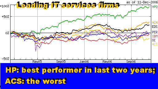 Overall, the market caps of the top 8 IT firms have risen by 25% since two years ago. Interestingly, only three companies (HP, Accenture, EDS) actually experienced double-digit increases. ACS was the only one with a double-digit decline.