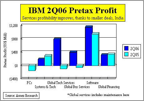 Clearly, IGS' anemic results indicate long-term problems that the reorganization from one year ago has failed to fix. And what are its problems? In a word, it is its size. The unit is simply too big for its own good. Nothing new there, of course, for Annex clients and readers. We have been saying since 1996 that Big Blue should consider splitting it up. Well, now that's even more evident than ever. And how should IGS be broken up? The most logical way to us would be to create a number of semi-autonomous industry units. This should speed up decision making, and make gigantic operation more nimble, and thus more competitive. But while IGS is having a hard time growing, there are a number of other things this IBM unit is doing right. It is increasing the share of smaller and more profitable deals in its portfolio. And it is lowering its costs by its Indian offshoring strategy. As a result, the IGS gross margin jumped from 26.1% a year ago to 27.7% in the latest period. We see this as another piece of evidence that IBM is now putting quality ahead of quantity (also see "IBM vs. HP: A Tale of Two Blues," June 2006). Hardware. IBM second quarter hardware results were mixed. A seven percent jump in mainframe revenues was a positive surprise. So was a 45% surge in Microelectronics business. But revenue shortfalls caused by operational problems in System i and System x server product lines were unexpected disappointments. "Our unusually high level of unfilled orders were due to end-to-end supply chain complexities which were primarily driven by parts and product transitions to support the RoHS (Removal of Hazardous Materials) requirement in Europe," explained Mark Loughridge, the CFO, in a post-earnings teleconference with analysts. This meant that a number of System i and System x orders were not fulfilled. Without this problem, the System i revenue would have been flat, and System x revenue would have risen by about six percent. The 10% drop in System p revenues, brought about by technology transition, was less surprising, especially as it compares to one of its best quarters ever (last year's 2Q). Despite these problems, IBM hardware revenues grew by 3% to $5 billion, thus continuing to be a bulwark of the company's recovery.