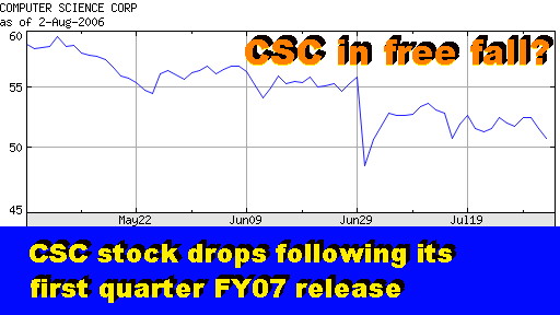 EDS also boosted its expectation for new contract sales for the year, estimating it would sign $23 billion to $25 billion in 2006. The company's prior goal was for $23 billion. During the first half of the year EDS has already signed more than $15 of new business. So we all important EDS financial indicators point up for the first time in 39 months since Jordan took over as CEO, it is more than a little ironic that the stock declined on Aug 1. C'est la vie on Wall Street these days... no rhyme nor reason evident this summer season. CSC Stock Continues Its Virtual Free Fall Meanwhile, the Computer Sciences Corp. (CSC) stock continued its virtual freefall following its announcement in late June that it was abandoning efforts to sell itself, and would instead divert some $2 billion of its capital toward stock buybacks. At least in CSC's case, there was plenty of reason, if not rhyme, for its decline. The company posted a quarterly loss $55.3 million, or 29 cents a share, as compared to a year-ago profit of $131.6 million, or 70 cents a share. And the revenue declined slightly to $3.56 billion, as declines in U.S. and European commercial sectors offset the strength in its federal contracts and Asia/Pacific operations. CSC also said it has been cooperating with government regulators in connection with a widening probe of stock-options grants. Additionally, the company said it has been named in two shareholder lawsuits alleging improper backdating of options issued to its executives. Most of the loss is due to a $215 million charge CSC took in the current quarter on account of a restructuring that will trim its payroll by about 5,000 jobs, mostly in Europe. Without the write-off, the quarterly earnings would have been 61 cents, up from 58 cents a share in the comparable quarter of last year.