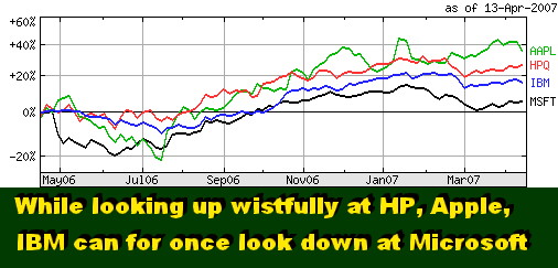 The same pattern is discernible from a comparison of IBM vs. five major competitors' profit margins. IBM net and operating profit margins are about three times those of its peers (see above chart). Outlook Based on everything we have seen and heard in the marketplace during the first quarter, this pattern will continue after tomorrow's results are release, if not widen in IBM's favor. IBM is likely to hit or exceed analyst expectations (revenues of $21.86 billion, EPS of $1.21, according to Thomson Financial). It remains to be see if the company gets the credit for it on Wall Street this time around that has eluded it in the past. During the last year or so, investors seem to be more preoccupied chasing the values elsewhere in the IT industry, such as Apple or HP, for example. Meanwhile,