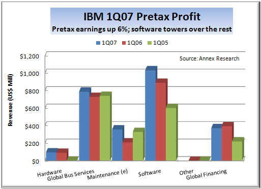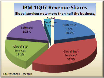 Updated 4/24/07, 11:00AM PDT, adds IBM ratchets up stock buybacks...Analysis of IBM First Quarter Business ResultsNo Big Surprises in Good Opening Quarter Mainframe, Unix Servers Lift Hardware Profitability; Services Sales Stumble Again; Software ShinesSCOTTSDALE, Apr 17 - "What do you think will be the market reaction? (to IBM's first quarter results)," a reporter asked this writer just before the company's teleconference with analysts this afternoon. "A shrug," was the reply. "Big Blue hit both the earnings and revenue targets but did not exceed either. There were no major disappointments. But there were no spectacular upside surprises, either. So it was a good quarter overall." IBM CFO's subsequent comments, and the