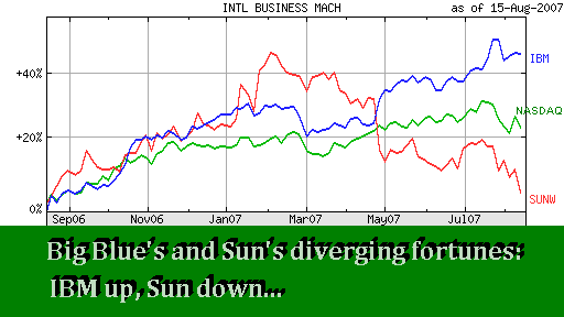 said Bill Zeitler, senior vice And what's in it for Sun? More business; bigger revenues, its CEO believes. "Once we separated our software and hardware businesses we've sold more of both," said Schwartz answering an analyst question. "We've seen the days of tying the hardware and software, and it just doesn't work (anymore)," he added. According to David Boyes, the head of Sine Nomine, a company that helped IBM port Linux to the System z, the Solaris move would help reassure (Sun's) StorageTek customers of continued mainframe commitment by Sun, and shore-up Sun's lost ground in the last four years with Solaris deployments in large enterprises (click here for Boyes' presentation on this). More Than Meets the Eye? Should IBM Acquire Sun? And what about the Unix competition? There has been no mention of Solaris on System p or Unix in the release. Would today's deal not diminish the opportunity for Sun new server sales? Possibly. So why would Sun do it? We don't know for sure. Maybe the Polaris revenue boost is enough? Or maybe there is more to come? Like porting Solaris to the System p. We think that would make sense for both companies. "That's certainly something I would like to see happen," said IBM's Zeitler, answering a question during the press conference. Sun's Schwartz did not disagree. "The relationship we have with IBM is really the strongest we have with any (IT) player in the marketplace," he said. He added that he and Bill (Zeitler) both hoped that it would open doors to "maximum market opportunities." And that may include a Unix deal, too. A soup-to-nuts IBM-Sun partnership could end up being a better deal for both - whether IBM acquires Sun, or enters into some sort of a joint venture deal that would eliminate the Unix competition between the two hardware platforms. Sun would then be able to save a ton of development money that's been going into the hardware competition with IBM. And IBM would gain huge influence on the industry, especially at the low end, where it is weak. And if IBM were to buy Sun, how much would such an acquisition cost? Probably about $24 billion, assuming a (hefty) 50% premium over the current market cap at just over $16 billion. The $6.9 share price (50% premium) would actually be only slightly above the 52-week high that Sun's shares reached in January (see above charts). So it's not like the would-be buyer would be grossly overpaying for the company. By the way, we first talked about Sun as a potential takeover target over four years ago (see “Let the M&A Games Begin,” Annex Bulletin 2003-20, June 2003). Its price back then was just a tad higher than it is today. Given IBM's improving and Sun's declining market fortunes, such a deal would probably boost both stocks. All IBM would need to do is stop throwing tens of billions of dollars in stock buybacks for a while, and voila... Big Blue would own a software company "par excellence." A software company? Yes. Sure, Sun has servers and designs chips; good chips at that (see below). But somebody else always manufactures them (Fujitsu, Texas Instruments in the past). So why not IBM? Furthermore, we have been saying for years that Sun's real "crown jewel" is its software, not its hardware: