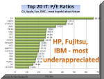 P/E Ratio. CA, Apple, Sun, EMC and Perot Systems, in that order, led the Top 20 in terms of their P/E ratios. Lexmark, HP, Fujitsu, IBM and EDS were the bottom five, with Dell just a notch higher. "Yesterday's" IT leaders seem to be languishing in the cellar, waiting for a second chance at redemption.