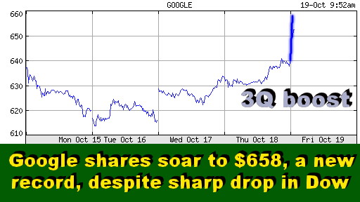 Not surprisingly, Google shares soared by another six points immediately after the earnings release to a new high of $645, after rising 1% in regular trading to close at $640. Google Shares Soar to $658 Despite Sharp Drop in Dow SCOTTSDALE, Oct 19 - Undaunted by broader market declines that marred most major IT stocks, and sent the Dow Industrials down in triple digits, Google shares soared after the opening bell this morning to $658, a new record high. But Google was not the only major IT stock to defy market gravity. Apple shares went even higher, also setting new records. Guess all that money that's fleeing the financial sector, the big IT stocks and the housing market, has to land somewhere. And what better place to do it that on two companies that have been the driving and defining force of the current decade - the "GooglePod" era, as we dubbed it in May.