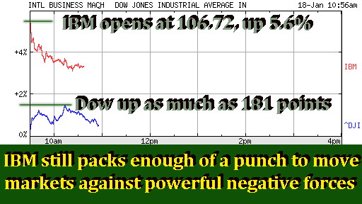 As you can see from today's upward market surge, IBM still packs enough of a punch to move markets, even against such powerful forces as those that had driven them down in the last three days. And Big Blue did it for a second time this week, leaving no doubt about it. On Monday, IBM grabbed the Dow by its bootstraps and pulled it up over 100 points (see "Big Blue Shines in Fourth Quarter," Jan 14). This morning, it did it by over 180 points. Of course, in each case, there were some other factors at work as well. A strong GE earnings release and a positive consumer confidence survey also contributed to the upward market surge this morning.