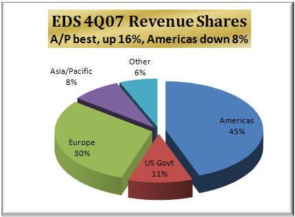 prior-year U.S. Government: Fourth quarter revenue was $624 million, flat compared to the prior-year period. Operating profit was $92 million, down 34%, due primarily to contractual price reductions. Europe: Fourth quarter revenue was $1.8 billion, up 3% from a year ago. Operating profit was $352 million, up 15% from 4Q06. Asia/Pacific: Fourth quarter revenue was $478 million, up 16 percent compared to the prior-year period. Operating profit was $71 million, up 41 percent from $50 million in the prior-year period, driven primarily by MphasiS and improved contract performance in the region. Outlook For 2008, EDS expects revenue of more than $22.5 billion and adjusted earnings per share of about $1.35, and hopes to sign new contracts worth more than $20 billion. The company also expects free cash flow of about $900 million. So 2007 was by no means a barn-burning year for EDS. But it was a year of solid sales growth and of repositioning of the company's strategies to take advantage of the higher margin deals in the marketplace (see "Moving Up the Stack," Feb 2007). As a result, we think that Wall Street's pessimism about the EDS future under Ron Rittenmeyer is exaggerated, just like its ebullience may have been overstated in the early years of the Michael Jordan era.