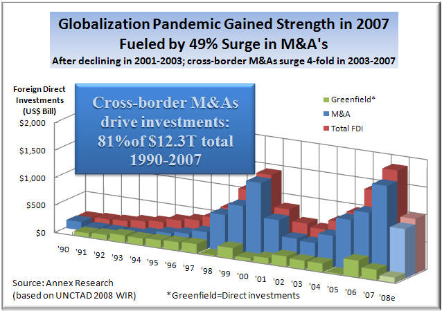 Updated 1/06/09, 6:30PM MSTAnalysis of Global Investment Trends Based on UN 2008 ReportThe Year of Living Dangerously"Globalization Pandemic" Gained Strength in 2007 Before Nose-diving Last Year; A Bankers-driven Fad, Not a Grassroots TrendSCOTTSDALE, Jan 6 – Large scope surveys are like antitrust courts. By the time they reach any definitive conclusions, the markets will have moved on, rendering the decisions inconsequential, except in terms of historical value. The annual foreign investment study conducted by the United Nations' UNCTAD branch is a case in point. If one peruses its latest (2008) survey report, one would get a glowing sense of