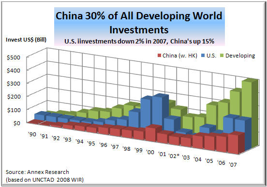 things in perspective, even after th And China, in turn, is dwarfed by the investments that the developed countries are making in each other's markets (right chart). It is there where the bulk of the growth in the last two years has come from. Since 2005, foreign investments in developed countries have more than doubled (from $611 billion to $1.25 trillion). In 2007 alone, they were up by 33%, while investments in the developing world rose by 21%. As you saw earlier, the EU investments were up 43% in 2007. If this trend were to continue, it would only widen the gap between the "have's" and the "have not's" in the world. Of course, that's nothing new (see "The Great Divide Widens," Oct 2008). SummaryThe "globalization pandemic" was very much in evidence throughout 2007. But it came to an abrupt halt last year. The only thing that remains to be seen when the UNCTAD surveyors collect and publish their data about the 2008 financial tsunami is by how much the global investments shrank. With the massive spending on the Olympics in 2008, China is still likely to stay ahead of the pack in the developing world. And India's cheap labor appeal is even more appealing in a recession than in good times. So we should look for the steepest reductions in the markets that have gone up the most in the 2005-2007 period - developed countries, especially the EU and the U.S. Alas, but the U.S. hasn't gone up that much, you're saying? In fact, it shrank even in 2007. Exactly. The financial engine of the world is being fueled by overseas economies. Nothing new there, except for the uninitiated. After all, five years ago, China's foreign investments were even bigger that those in the U.S. (see An Analysis of Global Investments 2003, Jan 2004). We have become the net exporters of both capital and jobs. Which is what the "globalization pandemic" is really about. But every so often, we hit a wall. Sometimes quite hard, like right now. In short, the law of gravity applies to global economics, too: "What goes up must come down." Even the Wall Street bankers are not immune from that. Of course, in plutocracy, they can always engineer a soft landing. Enter government (read taxpayer) bailouts. Happy bargain hunting! Bob Djurdjevic