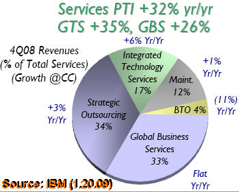 As a result, the fourth quarter net earnings jumped 17% to $3.28 per share, exceeding Wall Street's expectations of $3.03 per share by a wide margin. For the full year 2008, IBM earnings surged 24% to $8.93 per share, also beating expectations. And all that is mostly because services, software and financing now account for 90% of the company's profits. So even though its hardware revenues were down 16%, in line with the general malaise in the U.S. industrial sector, the foresighted strategy IBM adopted in the 1990s - to transition from being a product to a services & software company - is now paying dividends in spades. Add to it the company's excellent cash flow, and you can see why Big Blue is firing on all cylinders at this time. Business Segment AnalysisServices.