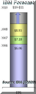was confident IBM would Lough "Given what we are seeing in the economy, we’re not counting on constant currency revenue growth to achieve this," he said. "It’ll come more from margin improvement, just as it did in 2008." IBM CFO added that, "with this strong 2008 performance, we are clearly ahead of pace on our roadmap to $10-$11 of earnings per share" (right chart).