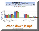 Updated 4/20/09, 10:30PM PDTAnalysis of IBM's First Quarter Business ResultsSometimes Less Is More and Down Is UpSmaller Is Better: Lower IBM Revenues Yield Higher Profit MarginsAlso, Oracle-Sun Deal Could End Up More of a Duel than Marriage; Odd Timing for Oracle's Entry into Hardware BusinessHAIKU, Maui, Apr 20 – All IBM revenue lines pointed downward at the end of the first quarter, yet its bottom line earnings were up 4%. It was another example of "down being up," a victory of quality over quantity. Big Blue used the global economic storm through which multinational companies have had to navigate in the last couple of years to cast off some ballast (i.e., shed costs and expenses), improve the profit margins and strengthen its balance sheet. As a result, IBM is an improved company qualitatively while shrinking quantitatively. And that's a strange concept for the stone-agers on Wall Street who still seem to think that bigger is better. The fact that they sold off the IBM shares in after-hours trading following the first quarter call is proof of it (IBM was down 1.8% after closing at $100.43 in regular trading today).