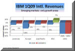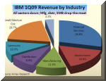 decreased 10% (down 2% in constant currency). Global Technology Servi IBM signed new services contracts totaling $12.5 billion in the first quarter, a drop of 1%. IBM said 16 contracts greater than $100 million were included in this total. But backlog was down by more than $4 billion to $126 billion, compared with $130 billion at year-end 2008. And that spells trouble. For, when the outflow of business from the backlog exceeds the inflow of new deals, what follows is a drop in revenues. So the revenue declines IGS is now experiencing are a consequence of a negative trend that started in 2008, and has evidently now extended into 2009 (see above charts). The only remedy to this problem is for IGS to sell more and lose less. And that's easier said than done, especially in current economic conditions. Geographies & Industries. Thanks to IBM's multi-year focus on emerging markets, revenues from overseas countries continue to grow about eight points higher than the rest. Major markets were down 4% in constant currency, while emerging countries were up 4%. India grew 12%, for example, while China was up 11%. As a result, the BRIC countries (Brazil, Russia, India, China) and the emerging markets in general were the only bright spots on the above chart of Big Blue's international revenues. IBM's industry results weren't a pretty picture, either. All six segments reported declining revenues. Government sector was the best, dropping only by 3% since a year ago. Interestingly, financial services, a part of the global economy that has been dragging everybody else down, declined "only" by 10% in IBM's case, less than the industrial segment (-20%), or distribution (-14%) or SMB (-12%). To us, the latter (SMB) sector was the biggest disappointment among the six. Less than two years ago, IBM touted it as its best global growth opportunity (see IBM: Lowering Center of Gravity, May 2007). And here it is now shrinking in double digits. Summary & Outlook IBM CFO reaffirmed the company's 2009 guidance during the teleconference with analysts. He also said that IBM is "well ahead of pace on our roadmap to 2010" ($11 per share net earnings - see BRIC by BRIC... to Top Line Growth, May 2007). One reason for it is that IBM's has been cutting costs at the same time as focusing on higher margin industry segments. It was a part of a strategy that the IBM CEO Sam Palmisano launched at an investor conference in Bangalore, India in June 2006. Here is our summary of it...